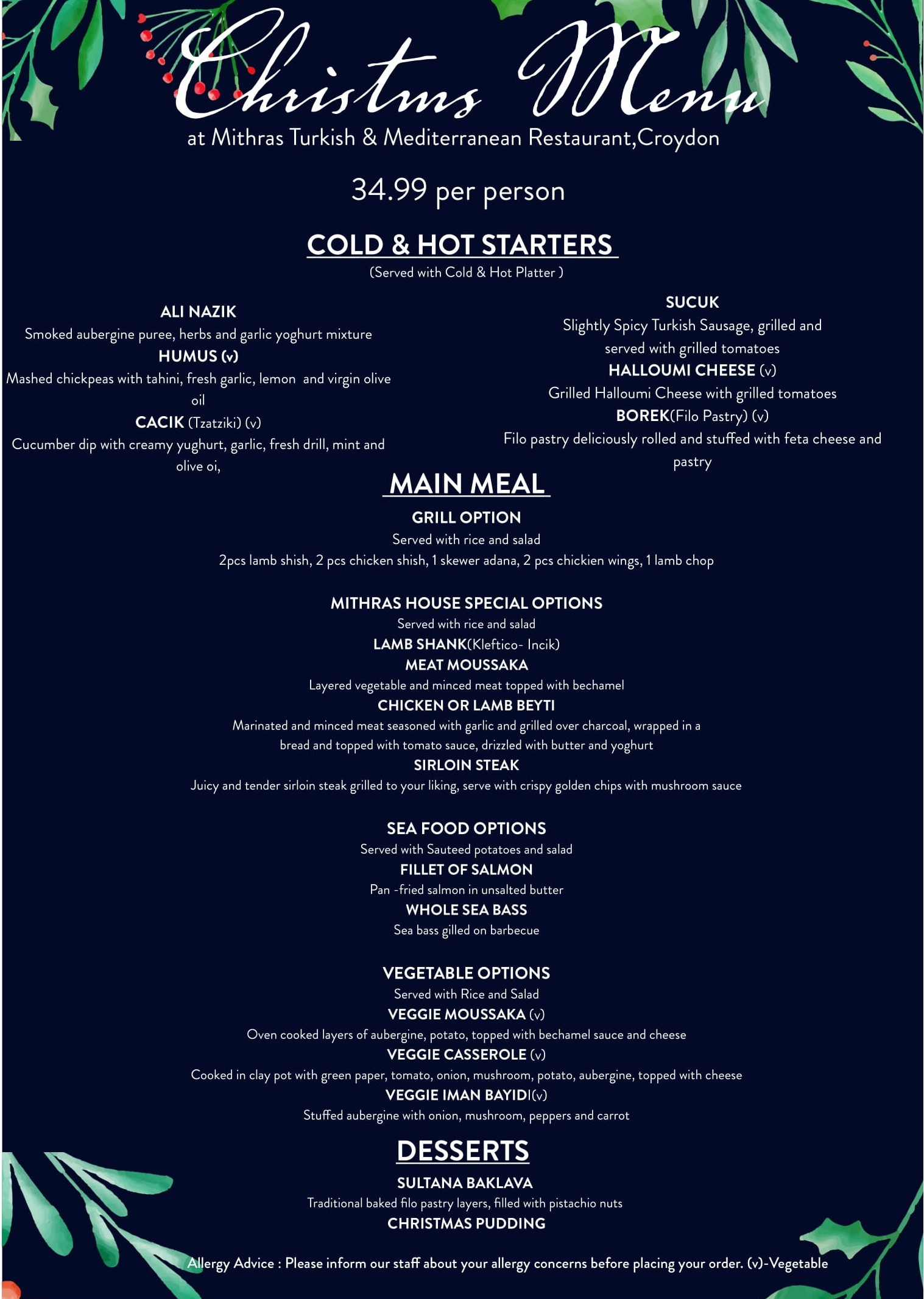 Join us this festive season at Mithras Turkish & Mediterranean Restaurant, Croydon, for a truly special dining experience. Our Christmas Menu, priced at just £34.99 per person, has been carefully crafted to bring together authentic Mediterranean flavours with a festive twist.
